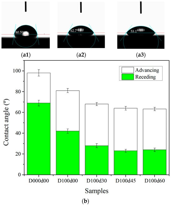 Wettability, indicating surface affinity for a lubricant, is determined by contact angle (CA) measurements, with angles below 90° denoting hydrophilic surfaces and those above 90° indicating hydrophobic surfaces. In general, a lower CA indicates enhanced wettability and good lubricity. Figure 8(a1–a3) display images of CA measurements following the initial dispense on surfaces of D000d00 (CA = 80.5°), D100d00 (CA = 62.7°), and D100d30 (CA = 53.1°). The contact angle decreases by 22.1% for just microscale texture, and by 34.0% for the multiscale textured surface compared to the untextured surface. These observations are in agreement with the Wenzel model [] which states that in the case of a completely wetting liquid and a hydrophilic surface, increasing the roughness factor leads to a reduction in the contact angle. This presence of micro or nanoscale roughness, such as LIPSS depicted on Figure 7a,b, facilitates enhanced wetting and spreading of the liquid.