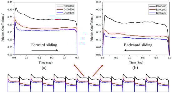 From Figure 9, it is evident that the friction coefficient varied throughout the entire cycle. Higher friction coefficients were observed at the beginning of both forward and backward slides, reaching a minimum around the middle where constant linear sliding speed occurs []. Additionally, a similar friction evolution trend was noted between forward and backward slides, as depicted in Figure 9a,b. However, consistently higher friction was observed during the forward slide compared to the backward slide in all cases. This phenomenon could be attributed to surface finish and the run-in condition between the contacting pairs.