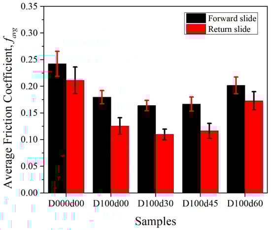 Table 4 lists the average friction coefficient for forward and backward sliding and indicating one standard deviation. Minimum friction coefficient was observed for D100d30 during both forward and backward slide. Figure 10 illustrates the average friction coefficients of three types of multiscale textures compared to two reference samples—an untextured surface and just microscale textures. The untextured surface displays a higher friction coefficient in contrast to the textured surfaces with multiscale textures exhibiting the lowest fiction coefficient.