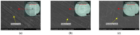 The primary wear mechanism of the UHMWPE pin sliding on the smooth untextured surface, (D000d00) was abrasive wear and created deep scratches, as well as some adhesive wear as shown in Figure 11a. In contrast, the pin sliding on just the microscale textured surface (D100d00) exhibits fewer and shallower scratch marks, indicating less damage by abrasive wear, as depicted in Figure 11b. However, some noticeable adhesion marks are observed. The sample pin articulated with the multiscale textured surface (D100d30), shows faint wear marks compared to both untextured and just microscale textured surfaces (Figure 11c). The original machining and polishing marks (not parallel to the sliding direction) are still clearly apparent on the UHMWPE pin surface after sliding against the multiscale textured surface (Figure 11c) but have been largely worn off after sliding against the smooth surface (Figure 11a). The change in wear mechanism is caused by the multiscale surface textures creating thicker lubricant films and trapping wear debris compared to the untextured surface. Similar results were observed in [,] where UHMWPE pins articulating with untextured and microtextured CoCrMo discs.