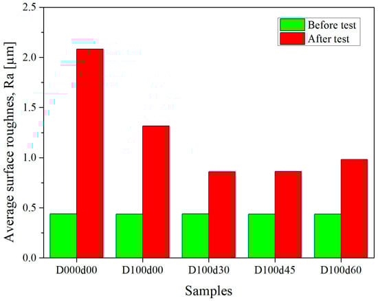 Figure 12 depicts the average surface roughness on the UHMWPE surface before and after the friction test. It is evident that the initial surface roughness (Ra 0.441 µm) of all pins increased after the pin-on-disc test due to the abrasive and adhesive wear damage. However, the change in surface roughness resulting from wear decreased by 58.7% for the multiscale textured surface D100d30 (Ra 0.859 µm), and by 36.74% for the only microscale textured surface D100d00 (Ra 1.317 µm), compared to the untextured surface D000d00 (Ra 2.082 µm). Within the multiscale textured surfaces, the change in surface roughness decreased as the texture density of interstitial textures reduced, aligning with both the friction coefficient and simulation results.