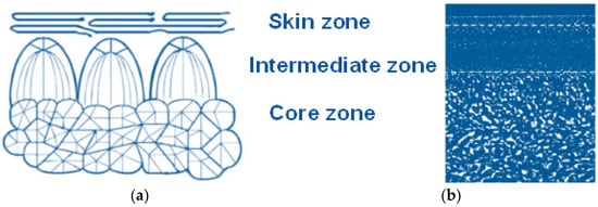 Morphological structure: (a) scheme of skin–core structure; (b) optical microscope—skin–core structure.