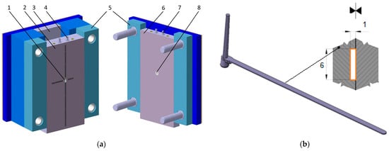 Injection mold cavity: (a) Test mold, 1—sprue holder, 2—mold plate, 3—ejection plates, 4—tempering system right, 5—mold frame, 6—test mold plate, 7—tempering system left, 8—sprue insert; (b) cross-section of mold cavity.
