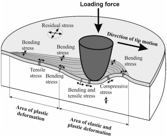 Ahead of the process, the indentor moves along the surface with a defined force to initiate the measurement device. Following the initiation, the indentor penetrates the test sample with normal force Fn, which leads to material deformation and the creation of an imprint. The sensors record the friction force Ft, which is proportional to the normal force, and a so-called pre-scan, which is concerned with the surface profile of the test sample before the penetration depth Pd (penetration depth) and post-scan of the imprint Rd (residual depth), which are important for polymer relaxation evaluation. Valuable information about the tribological properties of the material can be obtained from the difference in profile depths (Pd − Rd). Finally, the critical loads can be accurately measured using the acoustic emission AE and friction coefficient µ. Figure 5 shows a schematic diagram of the micro-tribometer.