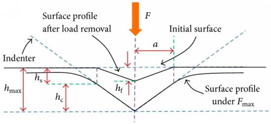 Indentation hardness (HIT) can be defined as the ability of a material to resist plastic deformation. Indentation hardness HIT (Equation (1)) is expressed by the ratio between the applied load Fmax and the contact area (Ap) between the indenter and the specimen at the maximum depth and load. The contact area Ap (Equation (2)) is specified by the shape constant of the indentor (24.50 for the Vickers indenter) and the depth of contact of the indentor with the test specimen hc [29,30].