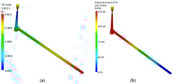After the simulation was started, all necessary calculations ran according to pre-set conditions. The complex Moldflow analyses provided numerous important results that were significant for the visualization of events taking place in individual phases of the manufacturing cycle and allowed the evaluation of qualitative parameters of the product. The goal of the simulations was to analyze the time of filling, injection pressure, and orientation in the skin–core layer. The results of these analyses provide important information for the stabilization of the injection molding process and the prediction of polymer behavior in the cavity.