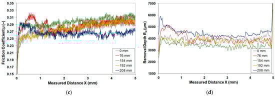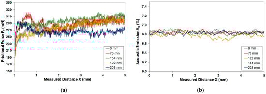 Using the scratch test, it is possible to examine the tribological properties of the surface layer of the tested injection-molded polypropylene, such as frictional force (Figure 8a), acoustic emission (Figure 8b), friction coefficient (Figure 8c), and surface profile after indentation (Figure 8d). The tribological properties were examined at five locations, which were specified at different distances from the point of the injection gate to the end of the part. The measured distance X was determined to be 5 mm for all samples. These tests can help with the prediction of surface resistance to abrasion and thus complement measurements of micro-mechanical properties such as hardness, modulus, etc.