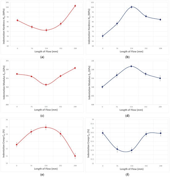 Influence of measurement depth and distance from the gate on mechanical properties: (a) indentation hardness—1 N (penetration depth 20 µm), (b) indentation hardness—5 N (measurement depth 100 µm), (c) indentation modulus—1 N (depth of measurement 20 µm), (d) indentation modulus—5 N (depth of measurement 100 µm), (e) indentation creep—1 N (depth of measurement 20 µm), (f) indentation creep—5 N (depth of measurement 100 µm).