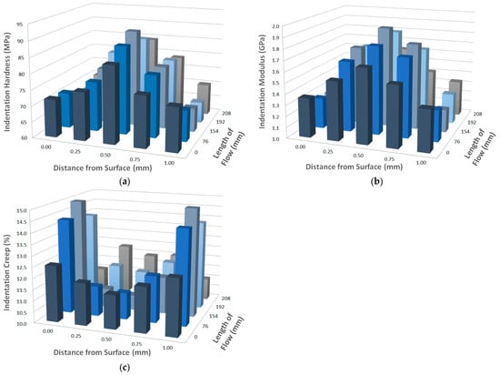 The indentation modulus (Figure 9c) characterizes the rigidity of the part, and it can be determined from the de-loading phase of the indentation cycle. The reported results (20 µm) of the indentation modulus display similar tendencies to indentation hardness. When compared, the modulus values measured at the end of the sample were 24% higher than at the gate. On the other hand, the indentation modulus measured in the middle of the sample was 55% smaller than at the gate.