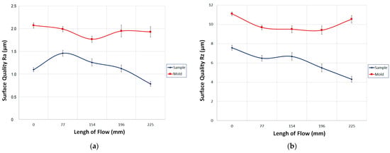 Influence of surface replication at varying distances from the gate: (a) surface quality Ra, (b) surface quality Rz.