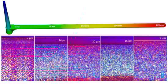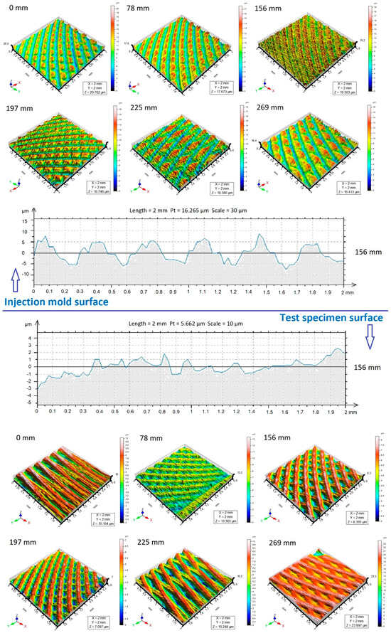 The surface profile, as shown by the 3D surface image (Figure 12), shows that the difference in replication is significant. During flow, the polymer failed to fill the biggest irregularities in the mold due to the temperature profile. For all measured points, a positive trend in surface replication was measured. The results of the tool’s and test sample’s 2D surface quality profiles indicate that the highest irregularities of the tool surface were not replicated on top of the test sample, which manifested in differing surface quality at individual measurement points. These tendencies were most likely influenced by the pressure drop in the cavity, enclosed air, and melt temperature.