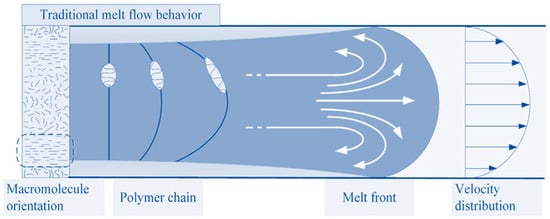 Furthermore, the influence of process parameters on the mechanical properties of the injected part has been studied in numerous other publications. Wang et al. [19] focused on the effect of process parameters (especially injection speed) on the mechanical properties of micro-injected PP samples. It was found that increasing injection speed led to higher hardness, which increased more in the perpendicular direction of flow than in the flow direction. A similar study was conducted by Glogowska et al. [20], who injected samples with differing process conditions. The samples were then grinded, injected again, and their mechanical properties measured. Sykutera et al. [21] investigated the influence of process conditions on the polymer viscosity, which was measured directly in the cavity. In general practice, viscosity is measured in rheometers, but the goal of this study was to provide real values coming straight from the manufacturing process. Studies [22,23,24,25] dealt with the effect of multiple process conditions (pressure and temperature) on final flow length.