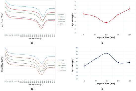 This sub-paragraph deals with observed changes in crystallinity (heat flow, Table 11) due to differing distances from the gate (Figure 15). Results of surface layer crystallinity indicate that the highest content of the crystalline phase is near the gate and at the end of the part. Towards the middle of the sample, the content of crystallinity decreases (Figure 15b). Crystallinity in the core layer (Figure 15d) points towards the opposite trend as observed in the skin layer. The highest crystallinity was measured at the center of the sample (158 mm). These results agree with the mechanical property measurements, which followed a similar trend.
