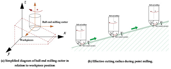 Milling is a process in which a milling cutter with one or more teeth makes cuts with intermittent motion. Typically, a complete milling motion consists of a rotary motion of the milling cutter blade and shank being held on a spindle, with a feed motion of the workpiece in a fixture [26,27]. During the milling motion, the spindle speed at the tip position of the ball end milling cutter is constant at zero, which very easily causes wear on the milling cutter, affecting the machining quality of the product. Therefore, to improve the service life of the ball end milling cutter, side milling is usually used in milling, i.e., the ball end milling cutter is at a certain angle with the workpiece, which promotes the increase of the milling radius of the ball end milling cutter [28,29].