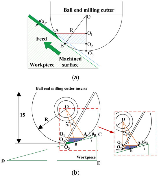 To allow analysis of the effective working area of the ball end milling cutter blade during milling, the two-dimensional model of the milling cutter and the workpiece is shown in Figure 2. Mathematical calculation of the positional relationship between the milling cutter and the workpiece defines the workpiece as triangle CDE, with ∠CDE = 15°. Point A is the highest point of contact between the milling cutter and the chip (related to the milling depth), and point B is the lowest point of the milling cutter and the chip formation (for the point of contact with the workpiece material). Hence, the AB arc is the main working part of the milling cutter because the milling cutter is perpendicular to the horizontal plane; point A and B will be projected positively in the center of the ball end milling cutter as the milling cutter is perpendicular to the horizontal plane, point A and point B will be projected on the center of the ball end milling cutter to form points O1 and O2, and point O3 will be the tip of the ball end milling cutter. So, OO3⊥DE, is the milling cutter surface working area for O1O2BA. Because OB⊥CD, BO2⊥OO3, then ∠BO2O3 =∠CED = 90°; because O2B∥DE, then ∠O2BO3 = ∠CDE = 15°; and because OB⊥CD, then ∠O1OB = 15°, that is, Φ1 = 15°.