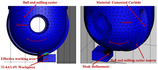 The designed micro-grooved milling cutter model is imported into the finite element simulation software, in order to obtain more accurate test results on the milling cutter and the workpiece mesh division; for the milling cutter distance from the milling area, the maximum mesh size is set to 0.1 mm; for the micro-grooved parts, the refinement of the mesh size is set to 0.01 mm; for the workpiece distance from the cutting layer, the maximum mesh size of the parts of the workpiece is set to 3 mm; for the workpiece surface of the cutting layer, the refinement of the minimum mesh size is set to 0.01 mm. The workpiece material is defined as titanium alloy, the size of the workpiece is defined as a rectangular block of 3 mm × 2 mm × 3 mm, and fixed constraints are applied to the bottom of the workpiece. The milling cutter material is defined as carbide, and the size of the milling cutter is a double-flute ball end milling cutter with a radius of 10 mm. During the milling process, the initial environmental temperature is set at 20 °C. The ball end mill rotates 360° during the simulation. In the metal-cutting process, the appropriateness of the friction model set between the chip and the tool directly affects the accuracy of the simulation results. This paper employs the Coulomb friction model for milling simulation, which accurately describes the friction state during the milling of titanium alloys, thereby enhancing the simulation’s accuracy. The finite element simulation mesh model of the milling cutter and workpiece is shown in Figure 6.