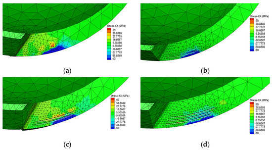 Milling belongs to intermittent machining; the insert force mode during milling is very complex, the magnitude of the force is related to the direction of the milling cutter, and the surface stress has a significant effect on the mechanical properties and fatigue life of the cutter. Figure 8 shows the change of x-direction stress during the simulation of four kinds of milling cutters at a spindle speed of 2500 rpm, from which it can be seen that the conventional milling cutter without micro-grooves has the largest area of stress distribution at the cutting edge, while the other three kinds of micro-groove milling cutters have stresses gradually spreading to the micro-groove part. It can be shown that the surface micro-groove can disperse the x-direction stresses generated during milling. Analysis of the milling cutter surface stress data shows that G1, G2, and G3 promote an x-directional stress reduction of 5.90%, 10.11%, and 13.76%, respectively, compared with the conventional milling cutter without micro-texturing. During the machining process, stresses are generated on the surface of the milling cutter due to the external forces on the material. When machining with a micro-grooved milling cutter, on the one hand, the stresses on the surface of the micro-grooved milling cutter are less than those of the conventional milling cutter due to the micro-groove on the surface, which promotes the decrease of the milling force. On the other hand, due to the micro-groove embedded in the surface of the milling cutter, the inner part of the micro-groove is perpendicular to the surface of the milling cutter, the edge of the micro-groove appears to have a sharp peak, and the micro-groove part is a certain distance away from the milling edge so that the high-stress area appears at the edge of the micro-groove.