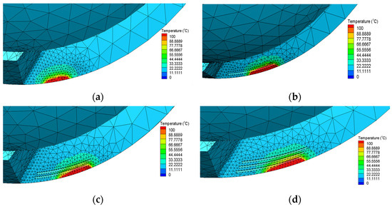 Effect of the number of micro-grooves on the cutting temperature. (a) Conventional tools; (b) G1; (c) G2; (d) G3.