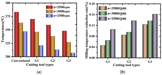 Milling temperature of milling cutters with different numbers of micro-grooves. (a) Effect of spindle speed on milling temperature; (b) rate of decrease in milling temperature.