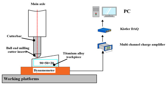 The milling test uses a CNC milling machine model CMV-850A (TTGroup, Jiangsu, China). The workpiece material is titanium alloy Ti-6Al-4V. The workpiece sample is a rectangular block of 90 mm × 50 mm × 20 mm. The milling cutter blade adopts double-edged YG8 carbide inserts. The milling test bench is shown in Figure 13.
