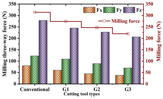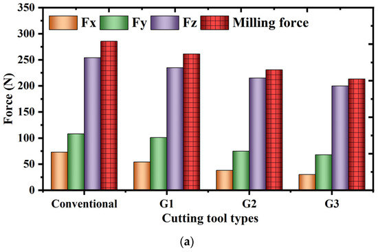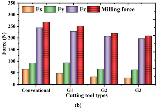 Figure 15 represents the changes in milling force under different spindle speeds. Figure 15a represents the changes in milling force when the spindle speed is 3000 rpm, from which it can be seen that compared with the conventional milling cutter, the G1 milling cutter promotes the decrease of the milling combined force by 8.43%; the G2 milling cutter promotes the decrease of the milling combined force by 19.14%; and the G3 milling cutter promotes the decrease of the milling combined force by 25.27%. Figure 15b shows the change of milling force when the spindle speed is 2500 rpm. From the figure, it can be seen that the G1 milling cutter promotes a decrease of the milling force by 7.97%; the G2 milling cutter promotes a decrease of the milling force by 18.23%; the G3 milling cutter promotes a decrease of the milling force by 22.34%. In the above analysis of the test results, it can be seen that compared with the conventional milling cutter without micro-grooves, the micro-groove milling cutter promotes a decrease of the milling force, and with the increase of the number of grooves, the milling performance of the micro-groove milling cutter is enhanced.