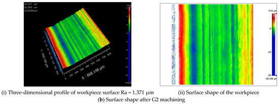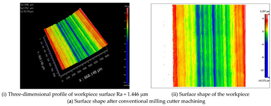 The machined parts’ surface roughness directly affects the parts’ service life. In this paper, the surface roughness of the machined workpieces was measured using a ZeGage™ Pro type optical profiler. The milling parameters used in the milling test are shown in Table 2. A conventional milling cutter and three kinds of micro-groove milling cutters were used for the milling test, and the milling distance of each type of milling cutter was 90 mm. Figure 16 shows the surface morphology of the workpieces after machining by the conventional milling cutter and the G2 milling cutter with a milling speed of 3500 rpm. The figure shows that the surface roughness of the workpiece after machining with the conventional milling cutter is 1.446 µm and that of the workpiece after machining with the G2 milling cutter is 1.371 µm. Thus, it can be seen that the G2 milling cutter contributes to reducing the surface roughness after machining.