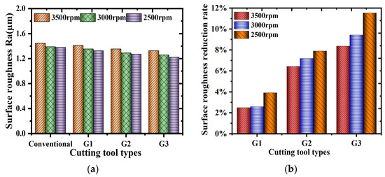 Surface workpiece roughness after micro-groove milling cutter machining. (a) Effect of the number of micro-grooves on surface roughness; (b) rate of surface roughness reduction.