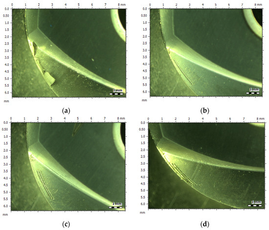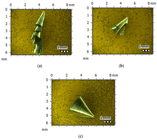 Using the Leica Ultra Precision Microscope (Leica Microsystems, Mannheim, Germany), the chips generated using the G3 milling cutter at different spindle speeds were collected, as shown in Figure 19. It can be seen from the figure when the spindle speed is high, the deformation of the cutting layer on the workpiece is severe within the same time, the chip formation speed accelerates, the chips accumulate in the milling cutter surface work area, causing a local temperature rise in the milling cutter, and the phenomenon of chip adhesion is prone to occur. When using a conventional milling cutter for milling, the milling cutter surface and chip make direct contact, and a large number of chips overflow and remove a large amount of heat. When there is a small amount of chip residue on the milling cutter surface, the milling cutter blade local temperature rises and thus increases the chip adhesion, resulting in the tool surface occurrence of a “cold weld”, affecting the machining quality. For the micro-groove milling cutter, to avoid direct contact between the tool and chips, the surface of the micro-groove can be used as a storage container for chips, reducing the friction on the surface of the milling cutter and, at the same time, increasing the heat dissipation area of the surface of the milling cutter, which contributes to the enhancement of the milling performance.