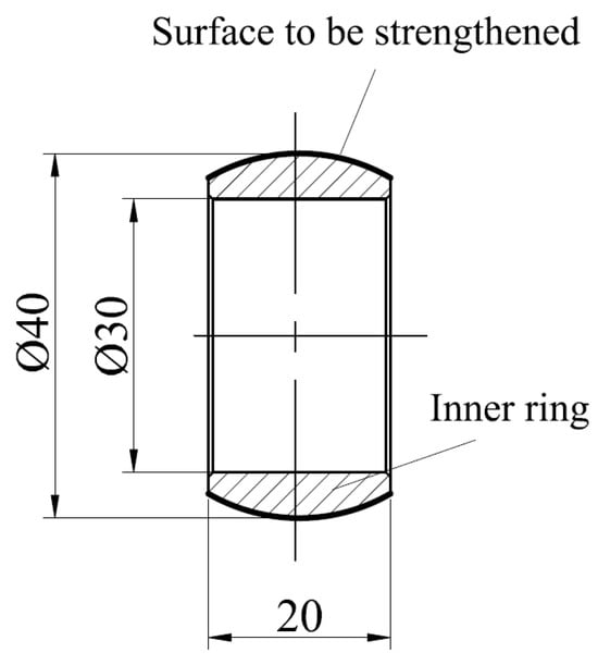 The GCr15 bearing inner ring selected in the test was quenched and finely machined. The hardness of the surface to be strengthened was 53 ± 0.5 HRC, and the roughness was 0.48~0.72 μm. The main chemical composition of the material is shown in Table 1. The outer surface of the bearing inner ring was spherical, and the dimensions are shown in Figure 1 (size unit: mm). In order to explore the strengthening effects of ultrasonic rolling on the surface of the inner ring of the joint bearing, ultrasonic rolling strengthening tests were carried out under various working conditions.