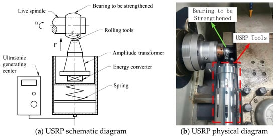 Figure 2a shows the schematic of the ultrasonic rolling strengthening apparatus. This work used a horizontal lathe with a special fixture to realize the clamping of bearing samples and the control of speed. The ultrasonic test center (Shanghai Xuanbang Metal New Material Technology Co., Ltd., Shanghai, China) was selected to adjust the amplitude during the ultrasonic rolling process, which mainly consisted of an ultrasonic generation center, transducer, amplitude transformer and rolling tool, and an ultrasonic frequency of 20 kHz. During ultrasonic rolling reinforcement, the rolling tool is installed on the tool holder and the feeding velocity (f) is generated with the feeding movement of the tool holder. Static pressure (F) during the USRP is adjusted by the spring compression in the static rolling tool, and lubricant is used in the strengthening process to improve reinforcement effect. The single-factor test was conducted for two strengthening parameters, e.g., amplitude and static pressure. Table 2 shows the value of the two parameters. During tests, the bearing speed was set at 250 r/min and the ultrasonic tool feeding speed was set at 30 mm/min. To examine the influence of amplitude, the static pressure was fixed at 450 N. In the single-factor test for static pressure, the amplitude was fixed at 15 μm. Figure 2b shows the process of the ultrasonic rolling test.