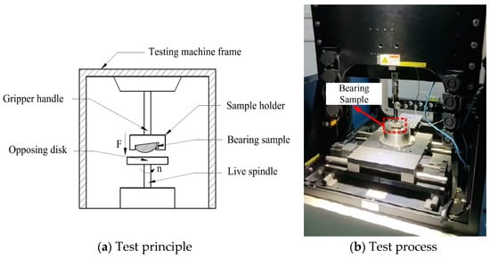 To investigate the effect of ultrasonic rolling on the wear resistance of joint bearings, the MFT-5000 friction and wear testing machine produced by Rtec intruments Inc. was used with a self-developed fixture for the wear resistance test of the sample. The equipment can record the friction coefficient in real time during the test. The principle of the friction and wear test is shown in Figure 3a. During test, the friction time was set to 40 min, the pressure was 100 N, the speed of the opposing disk was 100 r/min, and the grinding material was high-strength tungsten steel with a hardness of 88 HRC. The parameter selection was based on the practical application of large-scale spherical joint bearing. Since the surface roughness of the strengthened sample is low, it is difficult to observe large a wear spot on the sample in a short time under good lubrication conditions; therefore, no lubricating medium was used in the friction and wear test. The friction coefficient fluctuated greatly in the initial stage of the test; thus, changes in the friction coefficient over 38~39 min were selected for analysis. The friction and wear test process is shown in Figure 3b.