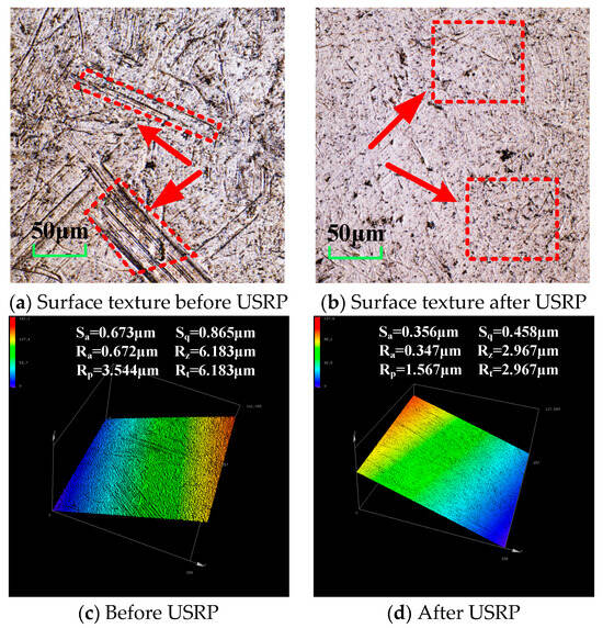 A 3D laser scanning microscope was used to inspect the sample surface before and after ultrasonic rolling enhancement, as shown in Figure 5.