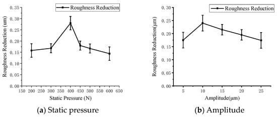 According to the single-factor test, Figure 6a,b shows the influence curves of static pressure and amplitude on the reduction in surface roughness, respectively.