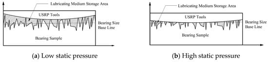Ultrahigh frequency repeated impact is the energy source for reducing the surface roughness of the sample. When the static pressure is too small, the energy of the high frequency vibration of the rolling head cannot be fully transferred to the bearing surface, the plastic deformation of the material is small, and the strengthening effect is not satisfactory. With the increase in static pressure, the impact energy received by the surface increases, the plastic deformation of the material surface increases, and the peak-to-valley effect is enhanced. However, as the static pressure continues to increase, the elastic displacement of the sample increases, and the stability of the strengthening process decreases. At the same time, under a large static pressure, the friction force of the sample surface increases, and the effective storage space of the lubricating medium decreases (as shown in Figure 7). The material structure cut during the strengthening process cannot be completely filled in the trough but sticks to the surface of the material and the surface of the rolling tool. As a result, micro-bumps are generated while the material attached to the surface of the rolling tool produces short micro-grooves on the surface of the sample; thus, the reduction effect of surface roughness becomes worse. As shown in Figure 6, when the static pressure is 400 N, the surface roughness reduction is the highest, ranging from 0.24 to 0.32 μm. Under this static pressure, the impact energy carried by the rolling tool reaches the balancing point, under which the vibration degree of the system is low and sufficient to produce a better peaking and valley filling effect.