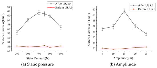 As can be seen from Figure 8a, the surface hardness, which is the difference before and after rolling reinforcement, first increases and then decreases with the elevation in static pressure. When the static pressure is 400 N, the hardness increase effect is better, and the hardening magnitude can reach more than 10%. Under low static pressure, the plastic deformation generated on the specimen surface is small and the residual compressive stress field is relatively low. The stress field may be smaller, the degree of grain refinement is low, and the hardness enhancement effect is poor. The stability of the system decreases under high static pressure, which makes it difficult to control the uniformity of the introduced residual compressive stress field. Thus, the strengthening effect decreases. As can be seen from Figure 8b, the hardness increase in the bearing materials is limited, the strengthening effect is notably better at amplitudes (15 μm), and the hardening can reach more than 10%. Similar to the strengthening effect of static pressure, the impact energy obtained on the specimen surface gradually increases with the rise in amplitude. The plastic deformation and dislocation movement inside the material increase accordingly. Then, the hardness increases. At a larger amplitude, the impact energy carried by ultrasonic tools is higher, which increases the elastic vibration of bearings and correspondingly increases the dissipation of plastic strain energy, making the distribution of residual compressive stress and dislocation movement difficult to control. Therefore, the hardness enhancement effect decreases at larger amplitudes.