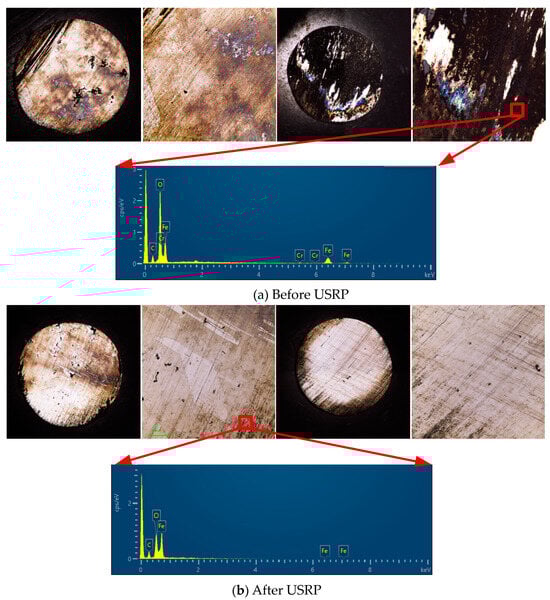 Under the same test conditions, the morphologies of scratches in the abrasive spot area of the strengthened sample were similar to that before the strengthening, but the erosion magnitude was greatly reduced at the abrasion spot. As can be seen in Figure 9a,b, after a certain time period, the abrasive spot that had not received the strengthening is almost fully covered by oxide, but a large area of metal can still be observed in the abrasive spot that had been strengthened after the same time period. The energy dispersive X-ray spectrometry analysis on the oxide at the abrasive spot was performed, and the spectroscopies are shown in Figure 9a,b. The wight ratio of Fe and O elements are shown in Table 3. The ratio of Fe (71.7%) to O (28.3%) was about 2.5:1 without strengthening, and after strengthening, the ratio of Fe (85.1%) to O (14.9%) increased to 5.7:1; that is, the proportion of the O element in the abrasive spot area is greatly reduced. This indicates that surface strengthening can enhance the erosion resistance of the bearing specimen.