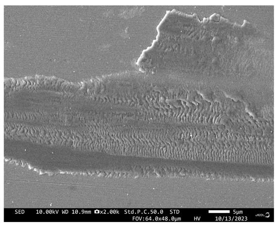 The specimen strengthened by USRP has lower surface roughness and the frictional resistance between the specimen and the grinding disk is smaller. At the same time, the hardness of the specimen strengthened by USRP is higher, and the toughness of the material is increased; thus, the resistance to plastic deformation can be improved []. Few abrasive debris and microscopic grooves are generated and the friction coefficient of the specimen strengthened with USRP is reduced. As for the wear volume, it is closely related to the friction coefficient, and a smaller friction coefficient corresponds to a smaller friction resistance. Coupled with higher surface toughness, the wear volume of the strengthened specimen decreases.