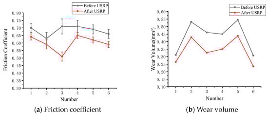 It should be noted that USRP has a certain difference in the degree of the reduction in the friction coefficient and wear volume of materials. Taking samples of number 2 and number 3 as an example: after USRP strengthening, the hardness of number 2 has increased greatly (12%); therefore, even though the reduction in the friction coefficient is limited (6.3%), the wear volume reduction effect is still large (19.2%). After USRP strengthening, the effect of the increase in hardness of number 3 is limited (5%); therefore, even though the reduction in the friction coefficient (28%) increased by 21.7% compared with that of number 2, the reduction in the wear volume (29%) was only increased by 9.8% compared with that of number 2. This indicates that the wear resistance of the material is not only related to the variation of the friction coefficient, but also to the hardening of the sample and the improvement in surface roughness, which collectively affect the wear volume of the material.
