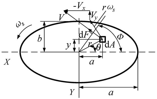 Figure 1 shows a schematic diagram of the contact between a steel ball and a raceway ellipse. dA is a microelement on the contact surface. Vx is the sliding velocity caused by the spin of the steel ball on the x-axis, Vy is the sliding velocity caused by the spin of the steel ball on the y-axis, ωrs is the tangential velocity at a distance r from the centre plane generated by the spin of the steel ball on the raceway surface, and V is the actual sliding linear velocity of the microelement dA, which is the synthetic velocity of Vx, Vy, and ωrs.