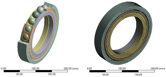The bearing material has a density ρ of 7.8 × 103 (kg/m3), a modulus of elasticity of 2.11 × 1015E (N/m2), a Poisson’s ratio μ of 0.3, a specific heat c of 482 (J/kg/K), and a thermal conductivity λ = 42.8 (W/m/K). The ambient temperature is 22 °C and the temperature of the lubricant is 95 °C. The grid cell type Solid186 is employed in the finite element simulation to mesh the inner and outer rings, the balls, and the cage of the bearings, respectively. The total number of cells is 17,707, and the total number of nodes is 59,224. The boundary conditions and rotational speeds are applied to the analysed model. Define the thermal loads and apply the calculated localised heat generation of the bearing to the surfaces of the inner ring, outer ring, balls, and cage, respectively, and the bearing heat generation and axial/longitudinal directions are taken as loads. The model is then solved using steady-state thermal analysis.