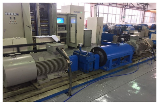 A double rotor bearing temperature rise detection device was designed for the experimental verification of the bearing temperature rise prediction model. The device is composed of a platform, a shaft system box, a spindle system, a hydraulic loading system, a lubrication system, and a detection system (see Figure 3). The loading mechanism comprises axial and radial loading, as illustrated in Figure 4. The outer ring of the bearing is connected to drive the outer shaft, while the inner ring of the bearing is connected to drive the inner shaft. The inner and outer shafts are driven by different motors, which can satisfy the simultaneous rotation of the inner and outer rings in the same direction or in the reverse direction. The axial load is applied to the inner ring of the bearing, while the radial load is applied to the outer ring of the accompanying test bearing situated in close proximity to the aerospace bearing. The bearing lubrication method employed is under-ring lubrication. The lubricant used is 4050 aviation lubricant, the inner wall of the inner ring of the test bearing is in contact with the oil supply hole, the lubricant is transported to the test bearing through the centrifugal force generated by the high-speed rotation of the shaft system, and the flowing lubricant will take away some of the heat of the bearing, which can be cooled on the bearing. The temperature detection infrared probe is fixed on the base and faces the inner ring of the test bearing. The temperature of the inner ring of the test bearing is measured by a non-contact infrared temperature sensor from Germany Miyi (micro-epsilon) thermoMETER CT.