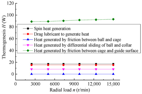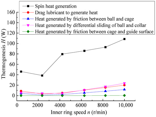 Through the above working condition parameters, the heat generation curves of the bearing’s five heat sources were calculated and are shown in Figure 6. From the figure, it can be seen that all the heat sources’ heat generation increases with the increase in rotational speed. The spin heat generation is the largest and most affected by the rotational speed. The heat generation of lubricating oil drag, ball and cage friction, ball and ring differential sliding, and cage and guide surface friction heat generation are relatively small, and the growth rate is smoother. This is because with the increase in the inner ring speed, the spin component of the contact point between the steel ball and the raceway of the collar is increased, and the linear velocity difference between the contact surface of the steel ball and the raceway of the collar is also increased. In addition, the inner ring speed is increased from 400 r/min to 2360 r/min, and all heat sources’ heat generation is reduced. This is because the bearing outer ring speed of 3000 r/min and inner ring speed of 2360 r/min are closer to the spin angular velocity at this time, resulting in a reduction in spin heat generation, a small difference in the linear velocity of the steel ball and the collar, and a reduction in the sliding between the steel ball and the raceway, so the frictional heat generated by each heat source is also increased. The friction heat generation of each heat source is also reduced. When the inner ring speed increases from 4320 r/min to 10,000 r/min, the speed difference between the inner and outer ring of the bearing is big and the heat generation of each heat source increases gradually, among which the spin heat generation of the bearing increases most obviously with the increase in speed.