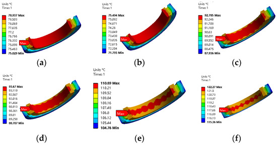 The temperature nephogram of bearing under different radial forces. (a) Radial load of 2450 N; (b) radial load of 5000 N; (c) radial load of 7350 N; (d) radial load of 9800 N; (e) radial load of 12,350 N; (f) radial load of 15,000 N.