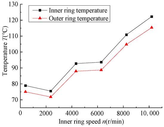Figure 11 shows the temperature variation curves of the inner and outer rings of the bearing under different radial forces. As can be seen from the figure, the temperature of the inner ring of the bearing is higher than that of the outer ring on the whole, which is due to the fact that the heat dissipation performance of the inner ring of the bearing is not as good as the heat dissipation performance of the outer ring, and the cages of the angular contact ball bearings under study in this paper are guided by the inner ring, i.e., a part of the heat generated by friction between the cages and the inner ring is also in the inner ring of the bearing. In addition, the temperature of the bearing increases with the increase in axial force. This is because the increase in axial force will cause the bearing friction torque to increase, resulting in more heat generation in the bearing, and then the temperature increases. When the axial load increases from 5000 N to 15,000 N, the axial load changes by 10,000 N, the inner ring temperature only increases by about 2 °C, and the temperature of the inner and outer rings of the bearing changes little. When the inner ring speed increases from 8000 r/min to 10,000 r/min, the speed changes by 1960 r/min, and the inner ring temperature changes by about 11 °C. It shows that the bearing temperature rise is more sensitive to the change of speed than the axial force, and the speed plays a dominant role in the bearing temperature rise.