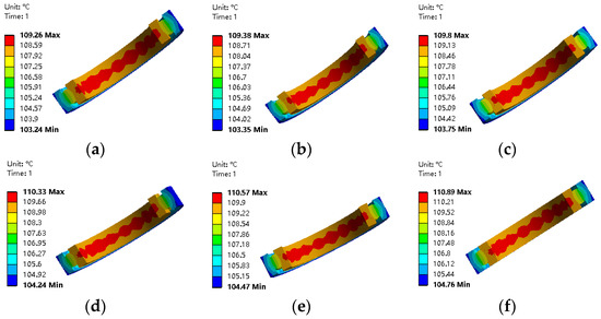 The temperature distribution of angular contact ball bearings under different radial loads was obtained through simulation, and the temperature distribution cloud diagram is shown in Figure 13. It can be seen that the maximum temperatures of the bearings in the above six conditions are 109.26 °C, 109.38 °C, 109.8 °C, 110.33 °C, 110.57 °C, and 110.89 °C, respectively. The temperature distributions are also relatively similar, indicating that the changes in the radial force of the bearings do not have a significant effect on the temperature of the bearings.