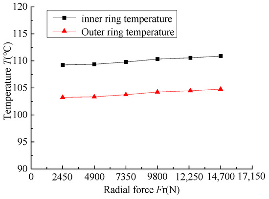 Figure 14 illustrates the temperature change curve of the inner and outer rings of the bearing in response to varying radial forces. As illustrated in Figure 13, the bearing exhibits minimal temperature change across six operating conditions, despite a 15,000 N increase in radial force. The temperature of the inner and outer rings rises by approximately 1 °C, indicating that radial force has a negligible effect on the temperature of angular contact ball bearings. This is because although the radial load increases the contact load of each steel ball, the friction heat generated also increases. However, the rotational speed and axial load of these two factors, which are triggered by the heat, are much larger than the radial load, which is triggered by the heat. Consequently, the radial load, which is responsible for the rise in the bearing temperature, has a relatively small impact on the bearing temperature.