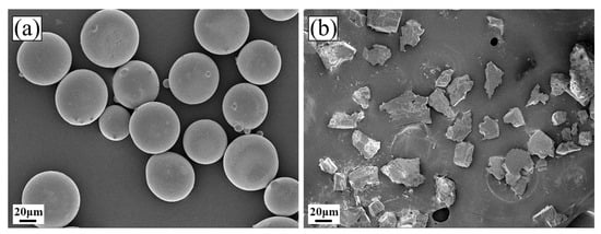 SEM morphology of the cladding material: (a) Fe60 powder; (b) TiC powder.