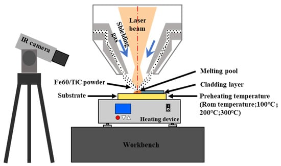 The experimental setup employed an XL-F2000T continuous fiber laser processing system (laser source model: MFSC 2000 W, manufacturer: Maxphotonics Co., Ltd., Shenzhen, China) with a maximum laser power of 2000 W, utilized for conducting laser cladding experiments on the surface of 65Mn steel. The schematic diagram illustrating the preparation of a single Fe/TiC composite coating layer is depicted in Figure 2. The laser beam, with a wavelength of 1080 ± 5 nm, produced spot diameters of 2.10 mm when interacting with the surface of the substrate. Before the laser cladding experiment, we use metallographic sandpaper (180–400 CW) to polish the substrate so that the scratches remain in one direction, clean the specimen with alcohol, and dry it for backup. To ensure the standardization of the experiment, we utilized the S1B-FF-110 × 100 flat sanding machine manufactured by Jiangsu Dongcheng Electrical and Mechanical Tools Co., Ltd. (Qidong, China) for substrate surface treatment. The substrate was preheated by utilizing a thermostatically controlled platform (model: DB-XAB; operating voltage: 220 V; maximum operating temperature: 400 °C; manufacturer: Shanghai, China). The temperature control range of the heater is RT-400, and the temperature control accuracy of the instrument is ±1 °C. Contact heating was employed to preheat the substrate. The lower surface of the substrate was in contact with the heating equipment to achieve temperature heating through heat conduction. The preheating temperature was categorized into four levels: room temperature, 100 °C, 200 °C, and 300 °C. In order to ensure the accuracy of the substrate heating temperature, we use the 225 s thermal imager produced by FOTRIC Smart Technology Co., Ltd. (Shanghai, China) to monitor the temperature of the entire preheating process. Once the predetermined temperature is reached, we wait for 10 min to ensure that the temperature tends to be stable. The temperature measurement range of the device is 0~350 °C, and the temperature measurement accuracy is ±2 °C or ±2%. The maximum value is taken when the ambient temperature is 10~35 °C. Based on these equipment and conditions, we conducted three sets of experiments to ensure the repeatability of the results. Therefore, the temperature heating method is accurate and reliable. Temperature contour diagrams, depicted in Figure 3, were generated upon reaching specific temperatures on the substrate, with Sp1 (10, 5, 2), Sp2 (10, 20, 2), and Sp3 (10, 35, 2) representing the coordinates of the temperature monitoring points. Argon serves as the protective gas during the laser cladding process, maintaining a gas flow rate of 10 L/min to prevent oxidation reactions between the cladding powder, substrate, and air. During the laser cladding process, the powder is transported to the surface of the substrate, and the substrate itself is not protected. The effect of airflow is to form a protective layer between the powder and the substrate to prevent the influence of oxygen.
