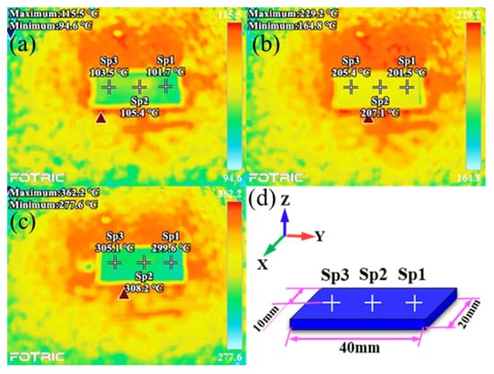 Temperature contour diagrams when the substrate was preheated to a predetermined temperature: (a) 100 °C; (b) 200 °C; (c) 300 °C; (d) temperature monitoring points.