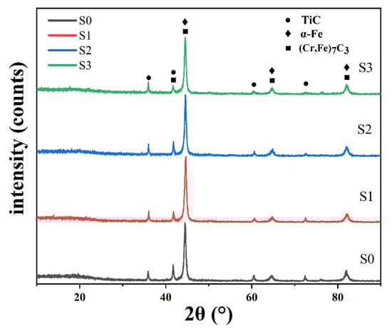 To assess the influence of different preheating temperatures on the phases of the coating, XRD tests were conducted on samples subjected to various preheating temperatures. The results are depicted in Figure 4. As illustrated, the composite coating exhibits several phases, including α-Fe, (Cr, Fe)M7C3, and TiC. It is noteworthy that while the diffraction peaks of the coating appear similar, the substrate preheating temperatures are different. Based on the Bragg law: 2dsinθ = nλ, (where d represents the interplanar spacing of the atomic lattice, θ is the angle between the reflection line and the reflection crystal plane, n is the reflection coefficient, and λ is the wavelength), the decrease in the peak angle associated with the α-Fe phase signifies an expansion of the lattice distance. It is important to highlight that in this investigation, the XRD spectra revealed the presence of corresponding diffraction peaks of the (Cr, Fe)7C3 phase. This phenomenon may be attributed to the following reasons: (1) The strong affinity between Cr and C atoms facilitates the formation of the (Cr, Fe)7C3 phase. (2) The similar atomic radius of Fe and Cr allows for easy substitution of Fe atoms for Cr atoms in chromium carbide, resulting in the formation of the (Cr, Fe)7C3 phase. This observation is consistent with the findings reported by Zhang et al. [].